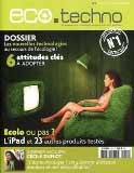 Ce nouveau magazine Eco‐techno accessible à l’écran et vendu en kiosque est novateur. En quoi ? Il conjugue un état d’esprit (être écolo) et une pratique (ne pas oublier les nouvelles technologies aptes à diminuer l’empreinte écologique). Selon Benoit Baume, rédacteur en chef, l’ « Eco‐techno est né d’une idée simple : nous aimons les technologies, nous pensons même qu’il est impossible de s’en passer, mais il est urgent de mieux les utiliser. Apporter aux lecteurs les clés pour comprendre et appréhender les écotechnologies, faire la part des choses entre le "vert" et le "gris" ou valoriser les produits et services technologiques qui participent à réduire notre empreinte écologique, voici notre pari. » Pour son premier numéro, il propose un dossier, miroir du lecteur, qui interroge : « Quel écocitoyen sommes‐nous ? ». On pourrait aisément ajouter « ou ne sommes‐nous pas !! » Il explore 6 attitudes écoresponsables. Une interview de Cécile Duflot et un banc d’essai en laboratoire du si couru Ipad. Face à face, news, tests et dossiers, guide d’achat, et même forum permettent la réactivité des lecteurs à l’écran, déjà adeptes du numérique !